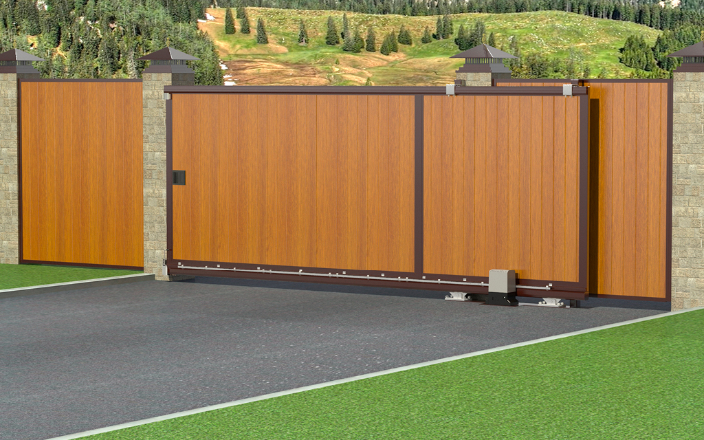 Откатные ворота представляют собой конструкцию, в которой полотно движется параллельно забору. Главной особенностью откатных ворот является отсутствие в проеме какой-либо направляющей, т.к. ворота стоят на двух роликовых опорах, расположенных справа или слева от проезда.