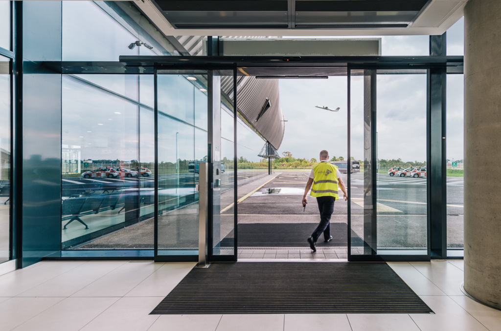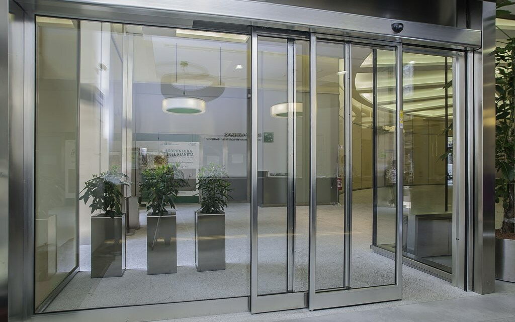 Наиболее популярный тип автоматических дверей. Подходит для перекрытия проходов шириной до 3 метров и может использоваться как отдельно, так и в комбинации из нескольких дверей, которые образуют входной тамбур. Благодаря своей универсальности может применяться практически во всех видах зданий от деловых и торговых центров до больниц и аэропортов.